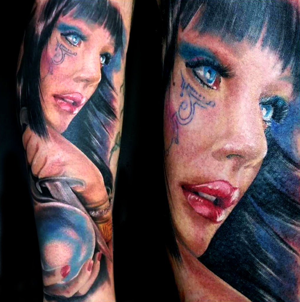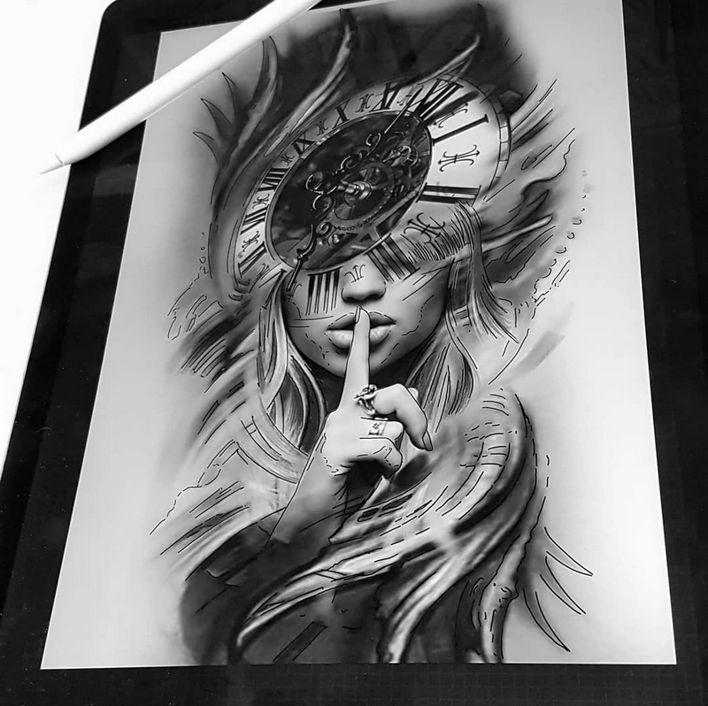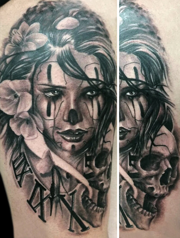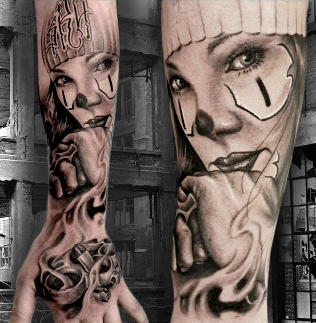 His favourite styles include black and grey, colour realism, Latino or Chicano designs, graffiti, and organic biomech.